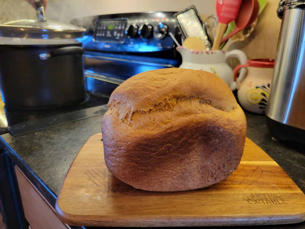 Anyway I have been baking a bit. This loaf of bread is golden honey wheat. I used my handy dandy bread maker to mix and bake this one. My thinking was that a homemade loaf has only good ingredients and I know exactly what they are. Do you want to know also? Great! Here’s the recipe: